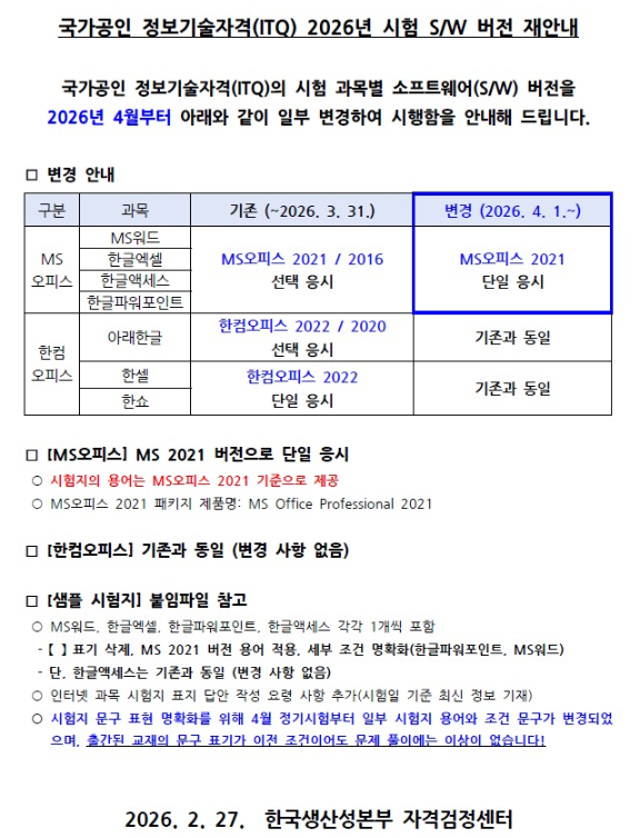 첨부파일 : [공지] ITQ자격_2026년SW버전재안내_260227.pdfMS워드,엑셀,파포_2021버전(단일), 인터넷(답안작성요령 추가)_샘플(최종)_260226.zip